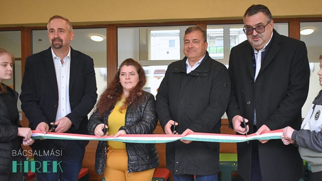 A nemzeti színű szalagot Németh Balázs polgármester, Dr. Mák Kornél alelnök, Bányai Gábor országgyűlési képviselő és kormánybiztos, valamint Molnár-Malatinszki Éva, az új bölcsőde vezetője vágták át.