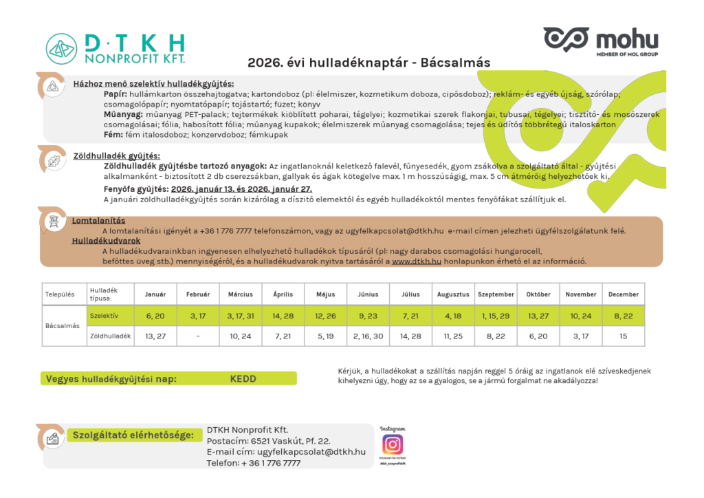 A Duna-Tisza Közi Hulladékgazdálkodási Nonprofit Kft. (DTKH) közzétette a 2026. évi hulladéknaptárt Bácsalmásra vonatkozóan, amelyben szerepelnek a házhoz menő szelektív és zöldhulladék gyűjtési napok, valamint a fenyőfa-gyűjtés időszaka is.