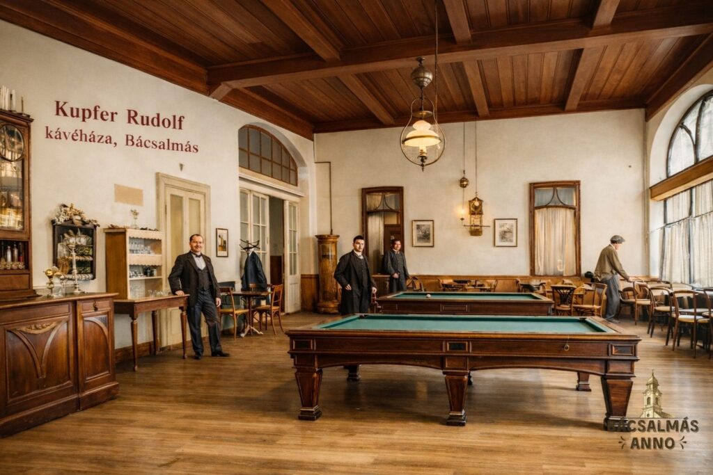 2026-ban is folytatjuk a sorozatot. Ezúttal a Kupfer kávéházról fennmaradt képeslapot tettük rendbe. A kávéházról meglepően kevés információ maradt fenn, még az elhelyezkedése sem teljesen biztos. Erős a gyanúnk, hogy az egykori Ambil Szálló épületében működött (ma a kínai áruház), mivel egy későbbi fotón pontosan ugyanolyan francia biliárd, azaz karambol asztalok láthatók ott.