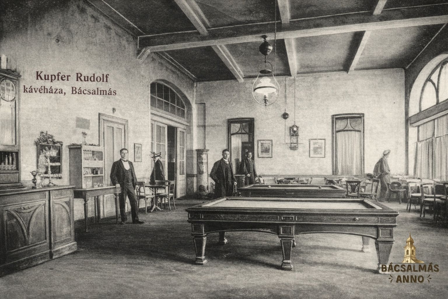 2026-ban is folytatjuk a sorozatot. Ezúttal a Kupfer kávéházról fennmaradt képeslapot tettük rendbe. A kávéházról meglepően kevés információ maradt fenn, még az elhelyezkedése sem teljesen biztos. Erős a gyanúnk, hogy az egykori Ambil Szálló épületében működött (ma a kínai áruház), mivel egy későbbi fotón pontosan ugyanolyan francia biliárd, azaz karambol asztalok láthatók ott.
