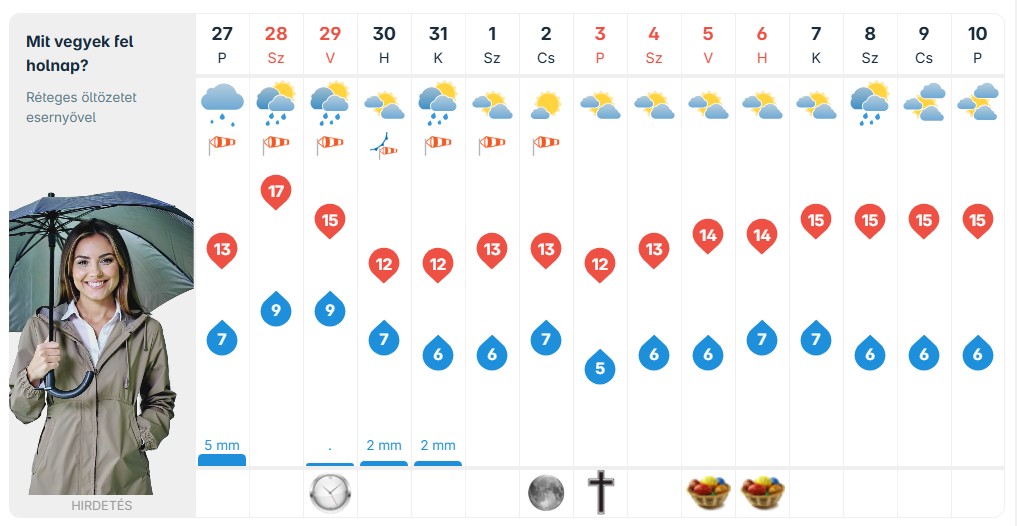 Pénteken és szombaton borult, esős időre számíthatunk, több hullámban érkező csapadékkal. A nappali hőmérséklet jellemzően 11–17 fok között alakulhat, a minimumok 5–9 fok körül várhatók. Az élénk, időnként erős szél miatt a hőérzet több fokkal alacsonyabb lehet.